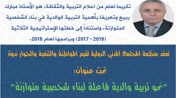 تكريما لعلم من أعلام التربية والثقافة، هو الأستاذ مبارك ربيع وتعريفا بأهمية التربية الوالدية في بناء الشخصية المتوازنة، واستناداً إلى خطتها الإستراتيجية الثلاثية (2017-2019) وبرامجها لعام 2018.