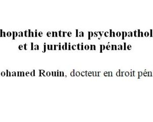 Psychopathie entre la psychopathologie et la juridiction pénale Mohamed Rouin, docteur en droit pénal Faculté de droit – Université Autonome de Madrid Espagne Date de